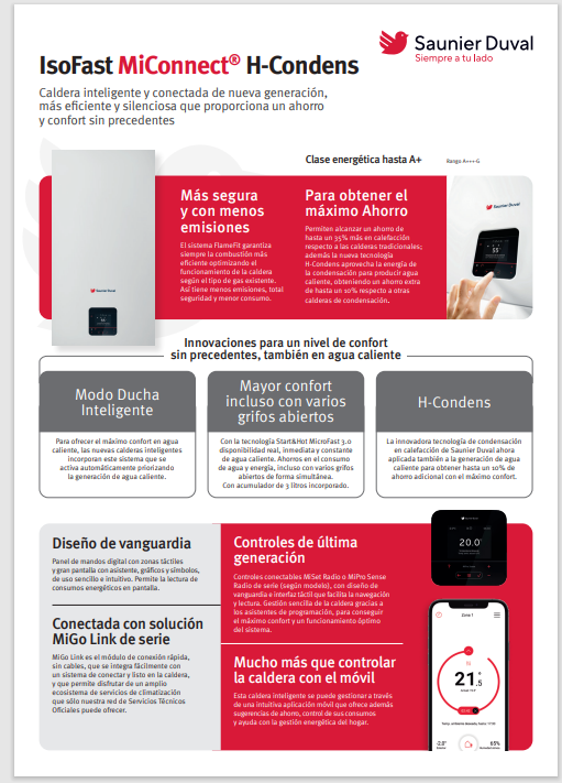 Caldera inteligente de última generación que reduce el consumo hasta un 35% en calefacción respecto a las calderas de no condensación.